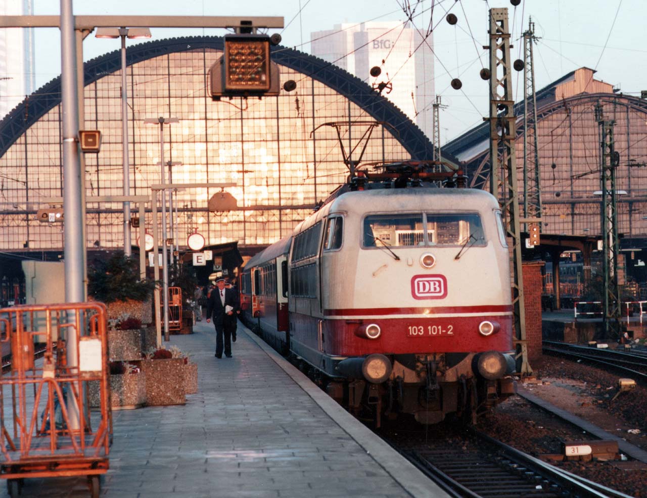 Vor zwanzig Jahren hatte ich dienstlich in Darmstadt zu tun und nutzte das gute wolkenfreie Wetter, um am späten Nachmittag mit dem Zug, die S-Bahn gab es noch nicht, nach Frankfurt/Main zu fahren. Dort konnte ich in bestem Abendlicht ein paar schöne Aufnahmen machen. Die Ereignisse aus der Prager Botschaft und die friedlichen Proteste in der DDR waren natürlich Hauptthema. So rangierte eine 290 den DDR-Postwagen vom Interzonenzug zum damals noch real existierenden Postbahnhof. Da die Lok dort längere Zeit mit dem Wagen auf Einfahrt wartete, kam ich mit den Rangierern ins Gespräch, wir faxten, ob an dem Wagen vielleicht im nächsten Jahr schon DB dran stehen würde? Jedenfalls waren die Rangierer zuversichtlich, dass die Arbeit nicht ausgehen würde, zumal das Postverteilzentrum gerade erst im Aufbau wäre. Leider zog dann doch der Dunst auf und das eigentlich geplante Sonnenuntergangsfoto entstand ohne Sonne. Kurze Zeit vorher stand die 103 101 mit ihrem InterCity-Zug abfahrbereit auf Gleis 6. Als ich dann abends ins Darmstädter Hotel zurückkehrte und dort von der Maueröffnung (von Fall konnte noch keine Rede sein) hörte und sah, fiel mir ein Stein vom Herzen und ich hoffte, dass die Stasi-Schergen, die skrupellos andere ans Messer lieferten und diese quälten oder gar töteten bestraft werden würden. Doch leider werden - wie aktuell in Brandenburg - solche Leute schon wieder gewählt als sei nichts gewesen ... Aber das ist ein anderes Thema. Leider finde ich das Bild der 290 nicht, es hat sich wohl in einem Karton ganz unten versteckt. |
