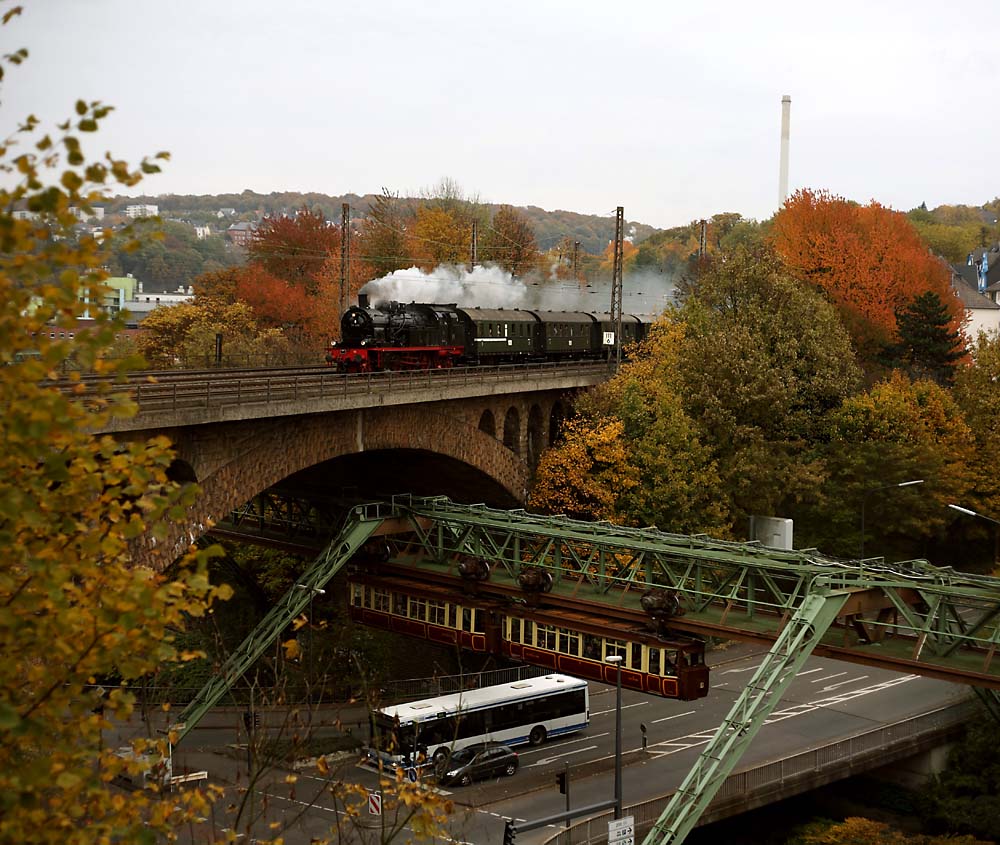 Verlassen wir den 9.11. und wenden uns wieder dem Alltagsgeschehen zu, leider konnte diese BIM-Ausgabe erst jetzt fertiggestellt werden, dafür gibt es auch ein paar interessante Herbstaufnahmen aus dem Jahre 2009, beginnen wir mit dem Solinger Brückenfest, gemeint ist die Müngstener Brücke. Die nun seit dem 27. Oktober nicht mehr als mit 100 Tonnen belastet werden darf. Damit ist der Verkehr mit herkömmlichen Zügen zukünftig erst einmal ausgeschlossen, nur die Triebwagen der Baureihe 628, aber auch die 643 und 644 oder 648, können weiterhin hier fahren, nur begegnen dürfen sie sich auf der Brücke wohl auch nicht mehr (war planmässig sowieso nicht vorgesehen, kam aber schon vor). Anstatt die nun 111 Jahre alte Brücke zu sanieren, kommen nun solche Einschränkungen ... |