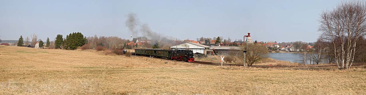 Dieses Bild entstand aus drei Bildern mit 50 mm. Zuerst wurde der Zug fotografiert, unmittelbar danach das linke Bild (damit der Dampf noch in der Luft war) und dann das rechte Bild. |