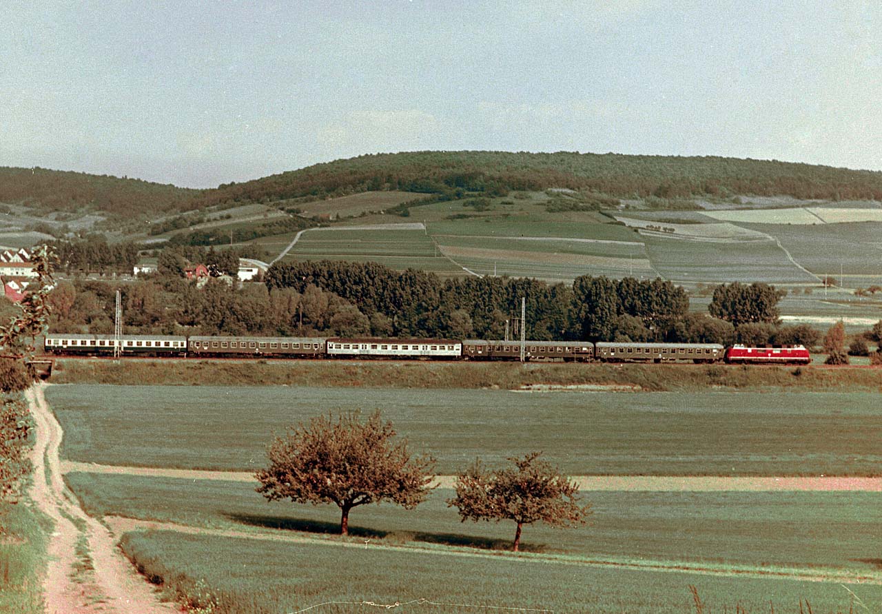 Bei solchen Bildern kommt dann Freude auf ... 220 002 ist zwischen Lauda und Königshofen unterwegs. Die Qualität ist für ein 6x9 Farbnegativ von Kodak schon ein Problem, das Filmmaterial war damals eben nicht so wie es sein sollte, nur mit List und Tücke liessen sich überhaupt die Farben einigermassen rekonstruieren. |