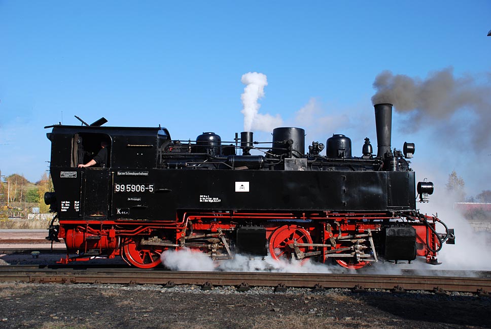 Auch im Sommer fahrplanmäßig waren im Selketal die samstags und sonntags verkehrenden Triebwagen-Ersatzzüge mit der Dampflokomotive, meist die Mallet 99 5906, hier bei Drahtzug am letzten Sonntag im Oktober. |